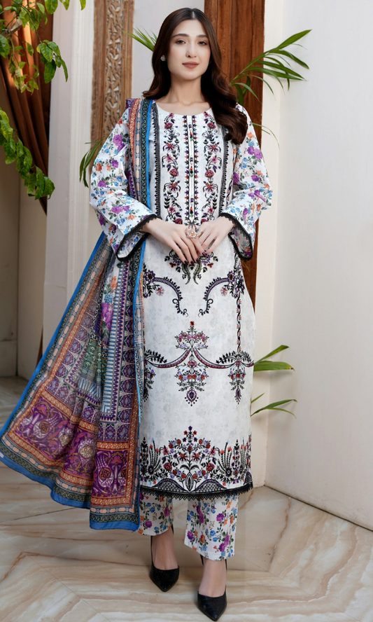 Stitched 3pc Suit ShirtFront embroided with PrintFabric : Cotton DupattaPrinted Dupatta Fabric : TrouserPrinted trouserFabric :...