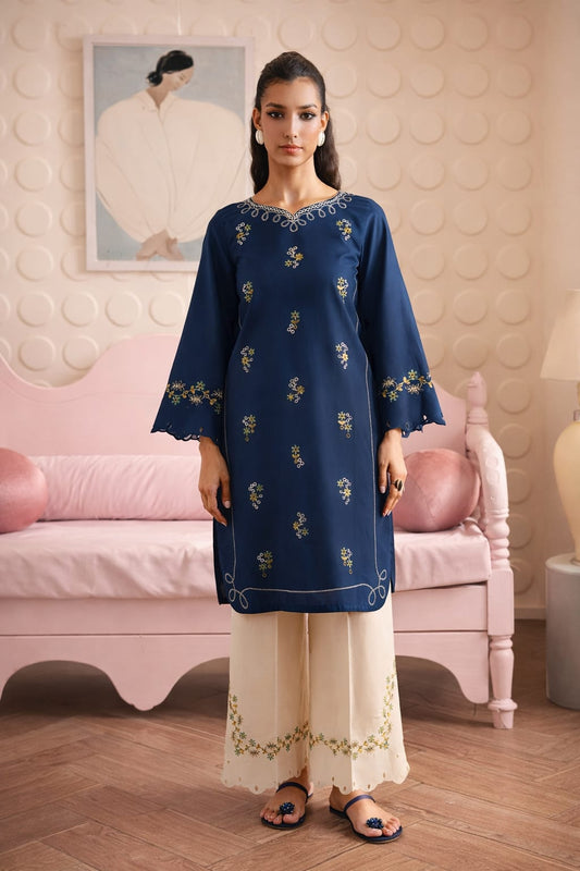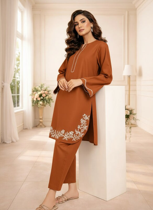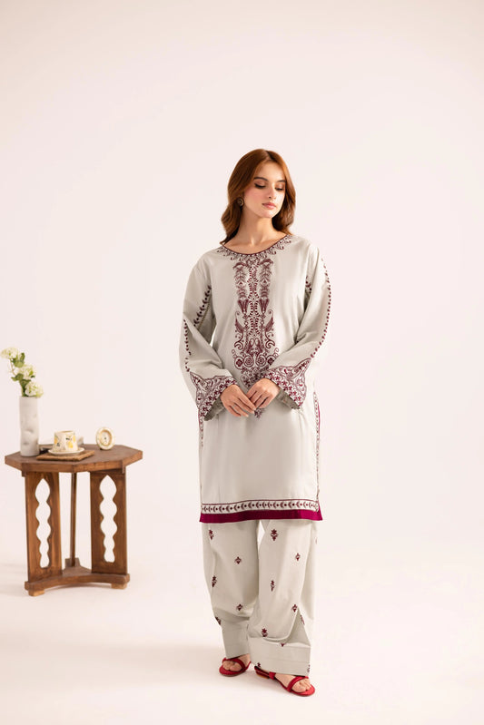 UnStitch 2PC SUIT This 2-piece suit features a long shirt adorned with intricate embroidery motifs...