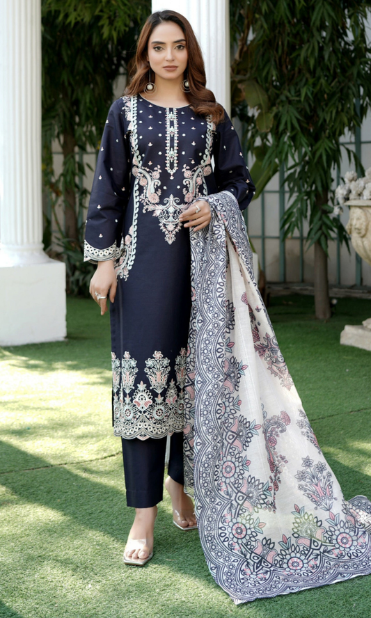 Stitched 3pc Suit ShirtFront embroided with PrintFabric : Cotton DupattaPrinted Dupatta Fabric : TrouserPrinted trouserFabric :...