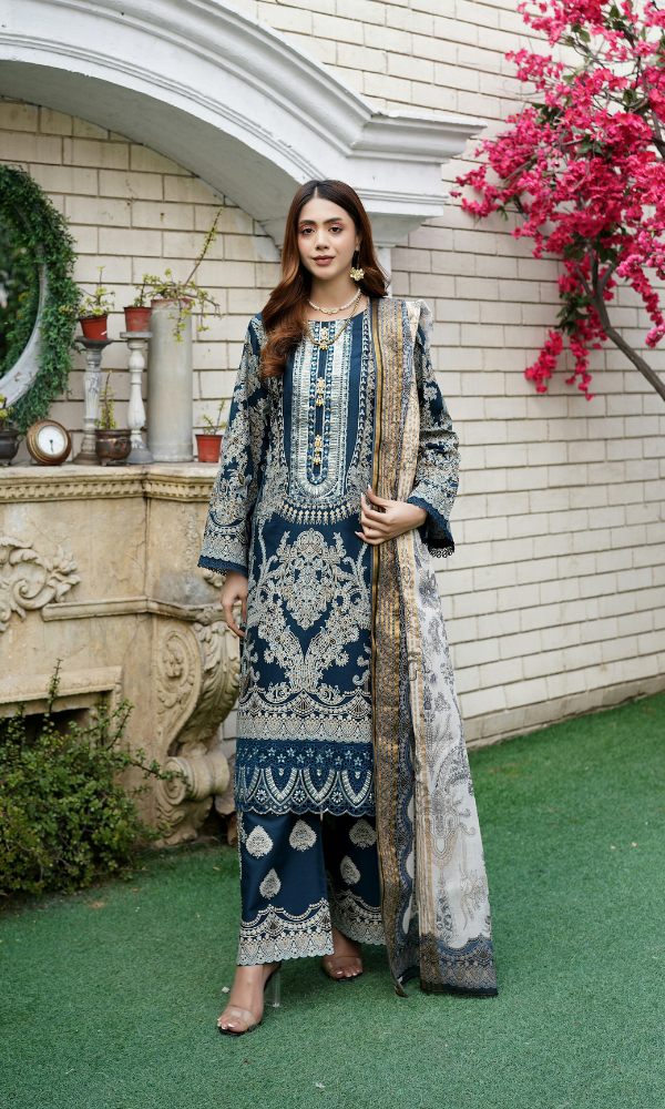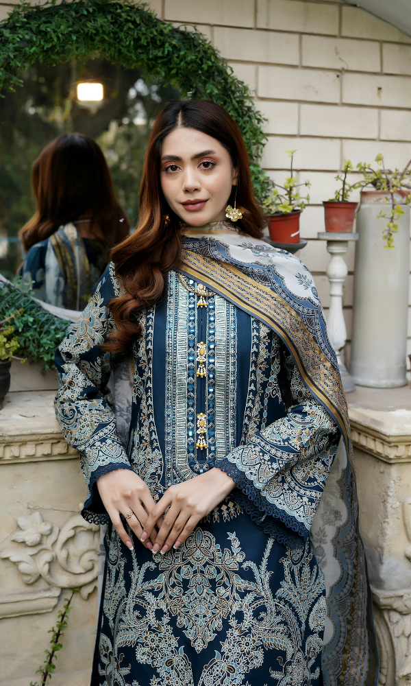 3 Piece Stitched Cotton Embroided Suit with Gold Print EJ-111