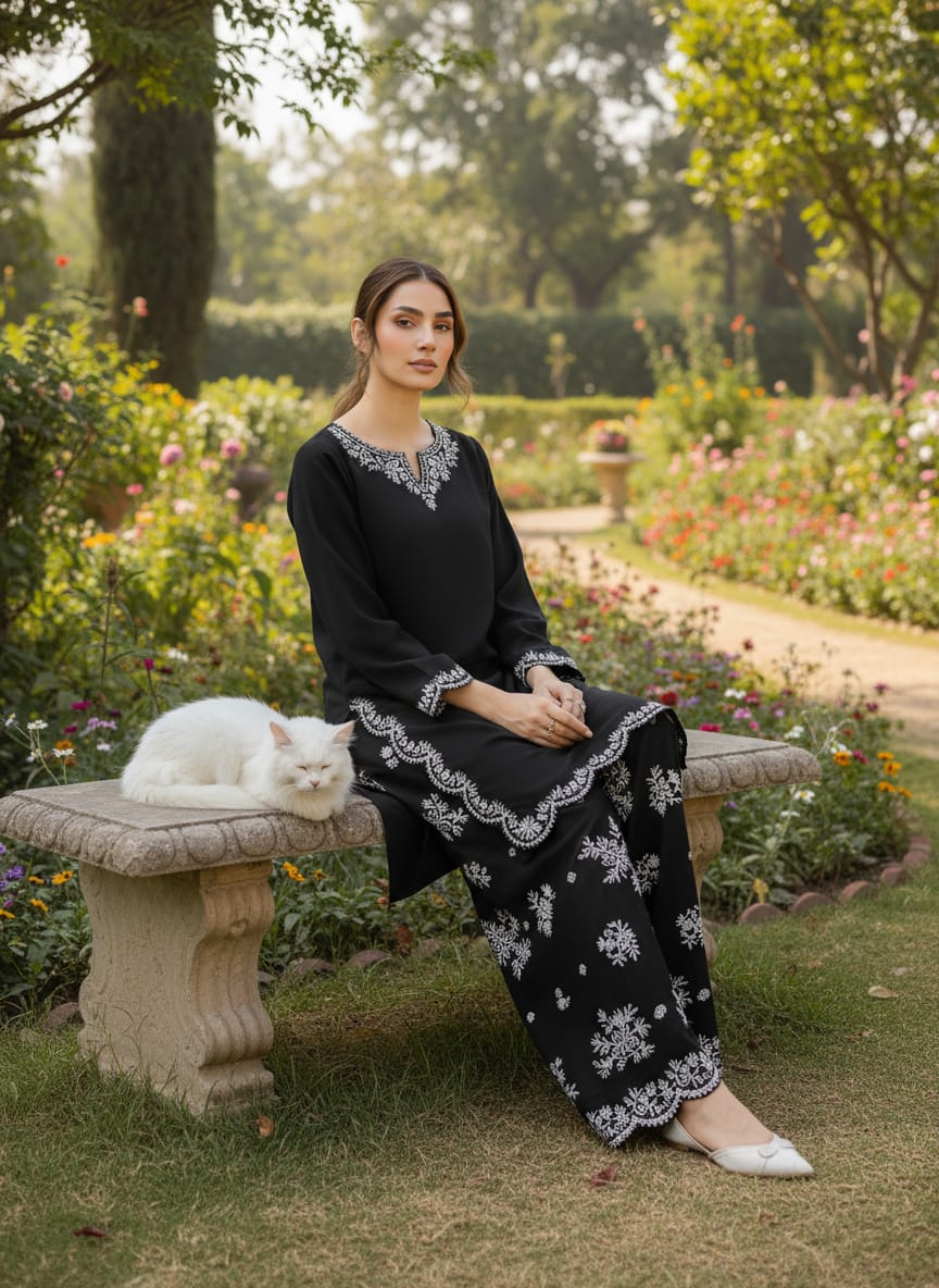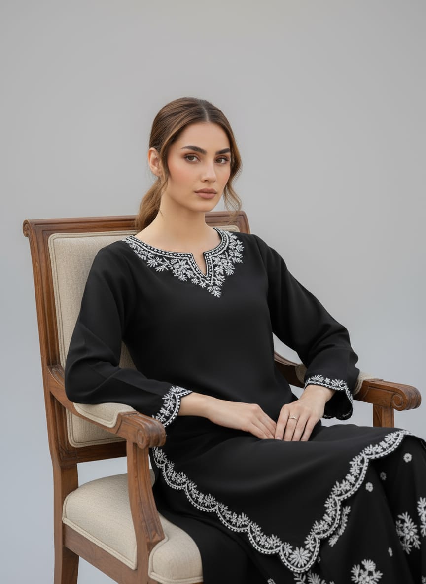 Paired with a matching Dhanak shalwar, adorned with coordinating embroidery, this ensemble offers a refined yet versatile look for everyday elegance.